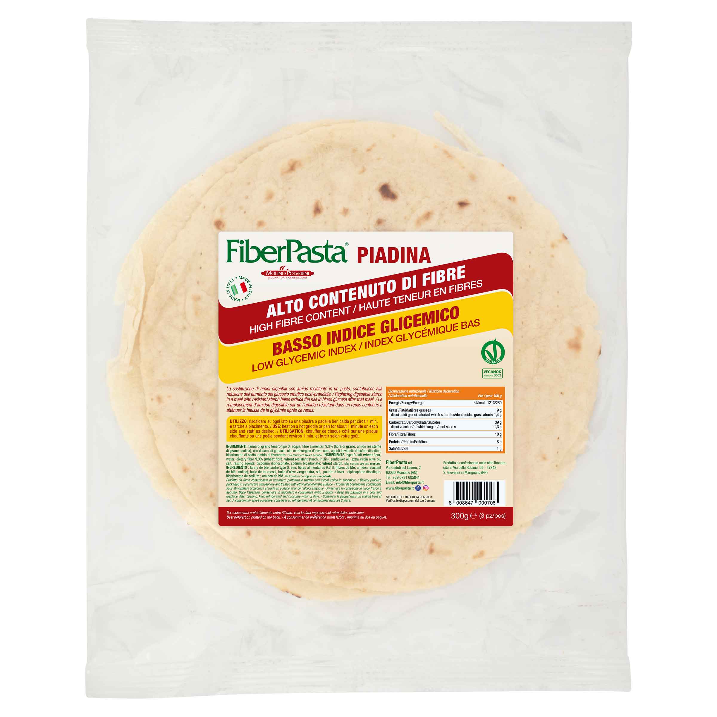 La Piadina a Basso Indice glicemico IG 34 ha un elevato contenuto di fibre (10%) tra cui fibre funzionali quali amido resistente e inulina. Contiene ingredienti di origine esclusivamente vegetale (non contiene burro o strutto).